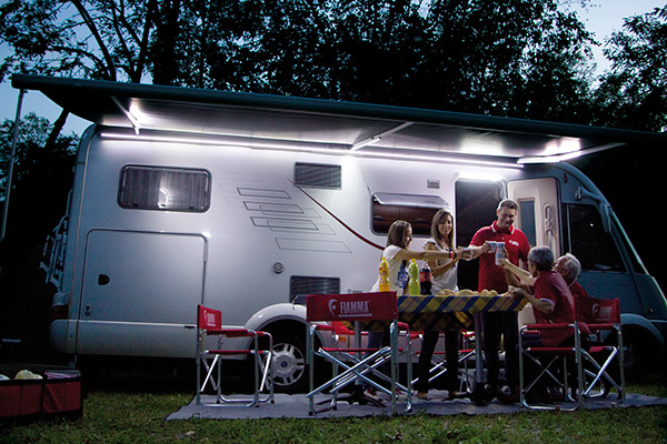 AWNING ARMS LED LED lighting system composed of 4 LED light kits mounted into sturdy supports and easily attached to the awning arms. The compact dimensions allow them to stay mounted, even when the awning is closed. Complete with 5 mt of cable for rapid connection.