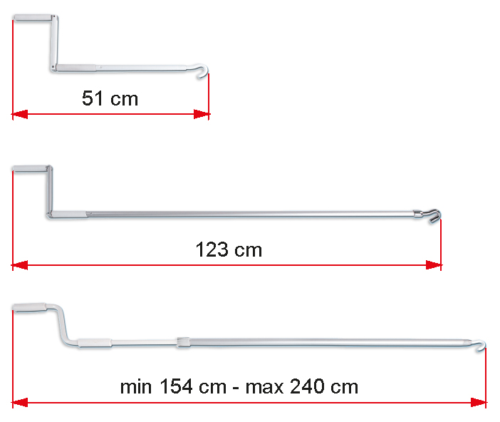 Telescopic: telescopic crank handle with fixed handle, ideal for high motorhomes and roof awnings (delivered as standard with F45L, F65L and F65s).