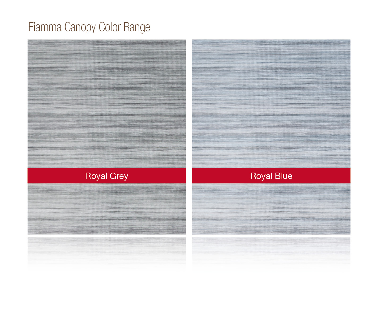 Standard fabric color: Royal Grey. Royal Blue offered in most sizes of White and Titanium awnings.